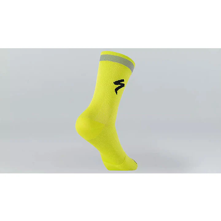The Specialized Soft Air Reflective Tall Socks provide the perfect hit of color and reflectivity in order to keep you visible to motorists at any time of the day or night. These socks feature super soft and compressive construction with added reflective yarns at the top edge. These threads are made up of millions of glass beads that receive and reflect light back to the source, so this reflective band gives you an active, moving element to make yourself more visible to drivers.